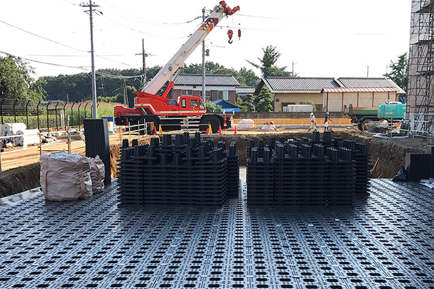 集中豪雨時の道路冠水対策、雨水利用施設として設置するプラスチック製雨水浸透貯留槽です。