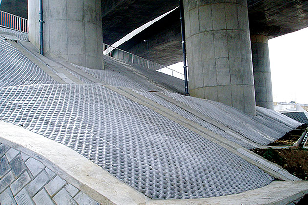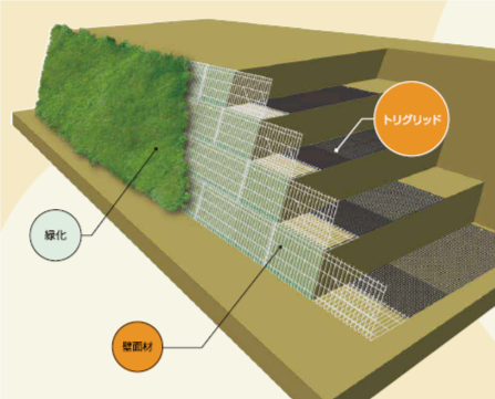 高密度ポリエステル繊維を束ねたものを芯材とし、格子構造状に構成したものです。土との一体性に優れ、急勾配の盛土や長大斜面などを経済的かつ容易に施工することが可能です。