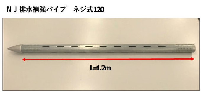 ストレーナ加工された鋼製の直径約6 ㎝の排水補強パイプを斜面に打設することにより、排水パイプとしての機能に加え、地山補強を併せ持つ工法です。