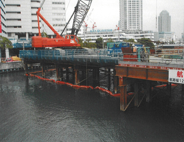 グラブ浚渫や捨石工事に使用します。浚渫区域が広い等移動の多い工事に最適で、排砂管等のフロートにカーテンを取り付け、ワイヤーで吊り下げて掘削した深さに合わせてカーテン長を調節します。
